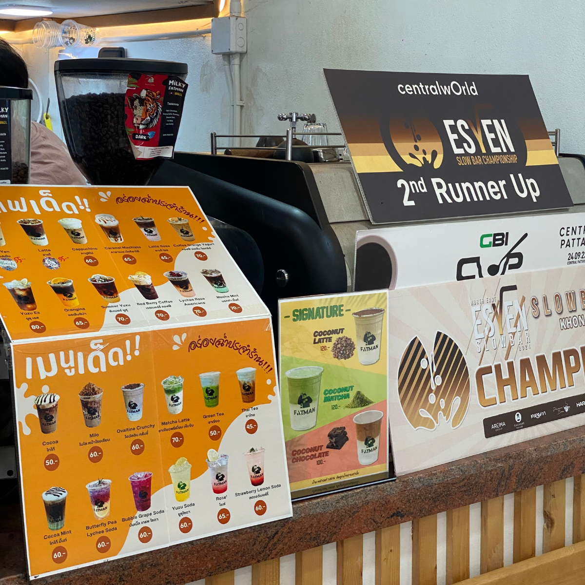 แน่นอนว่าเมนูสุดพิเศษที่อยากให้ทุกคนมีโอกาสได้ลิ้มลองจะเป็นอะไรไปไม่ได้นอกจาก ESYEN สูตรจากแชมป์ โดยคุณเบ๊นซ์เล่าว่าสูตรลับเฉพาะนอกจากเมล็ดกาแฟจาก Fatman Coffee แล้ว นมสูตรลับนี่แหละที่ทำให้ได้แชมป์มา อยากให้ทุกได้ดื่มกาแฟคุณภาพจากฝีมือแชมป์ในทุกๆแก้วและราคาที่จับต้องได้
