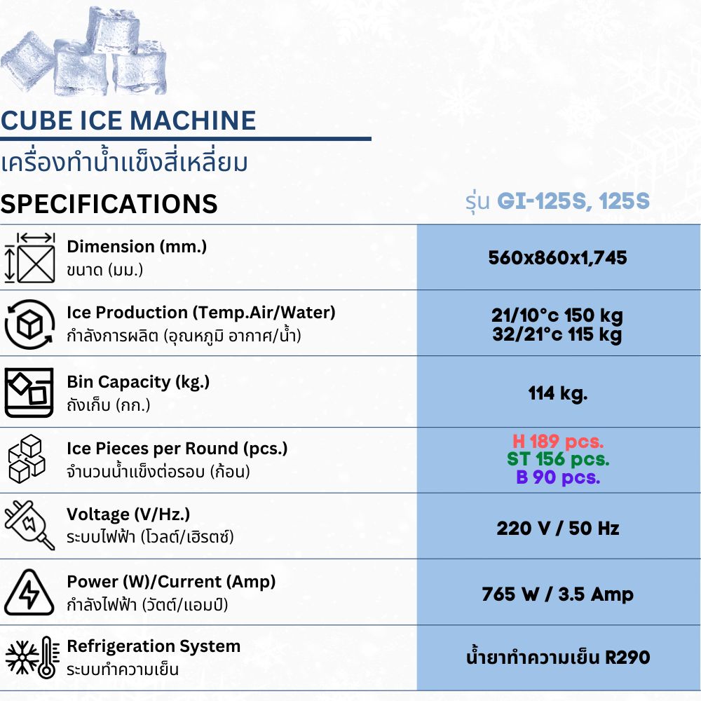 เครื่องทำน้ำแข็งเจ็นไอซ์ ผลิตน้ำแข็งสี่เหลี่ยม รุ่น GI-125S