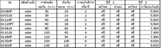 - หากเครื่องเกิดบกพร่องในระยะเวลารับประกัน บริษัทจะจัดให้มีน้ำแข็งเพื่อใช้งานระหว่างรอซ่อม